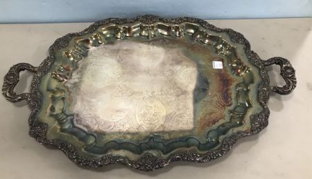 W & S Blackinton Silver Plate Footed Tray, has tarnish, handled, etched designs, 28"w. W & S Blackinton Silver Plate Footed Tray, has tarnish, handled, etched designs, 28"w.