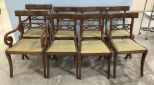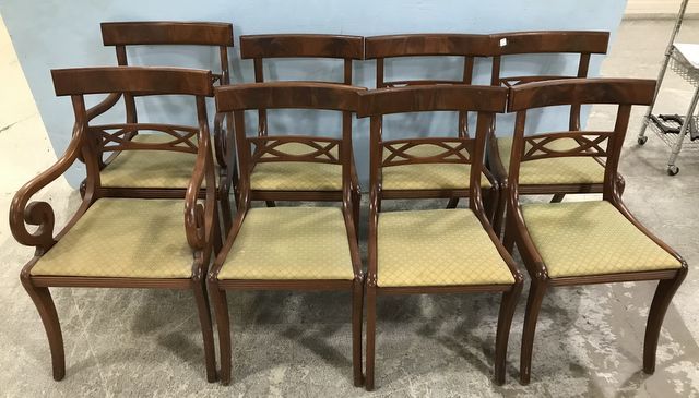 8 Mahogany Duncan Phyfe Dinning Chairs, two arms, 6 sides, gold fabric seats, 32"h. 8 Mahogany Duncan Phyfe Dinning Chairs, two arms, 6 sides, gold fabric seats, 32"h.