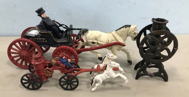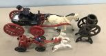 Reproduction Cast Iron Chief and Fireman Horse Buggy, and cast iron grinder. Reproduction Cast Iron Chief and Fireman Horse Buggy, and cast iron grinder.