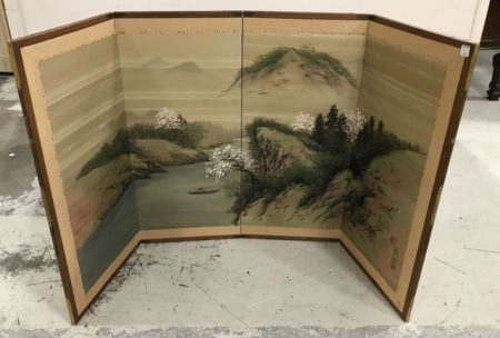 Oriental Four Panel Folding Screen, river landscape, black frame, 36"h. Oriental Four Panel Folding Screen, river landscape, black frame, 36"h.