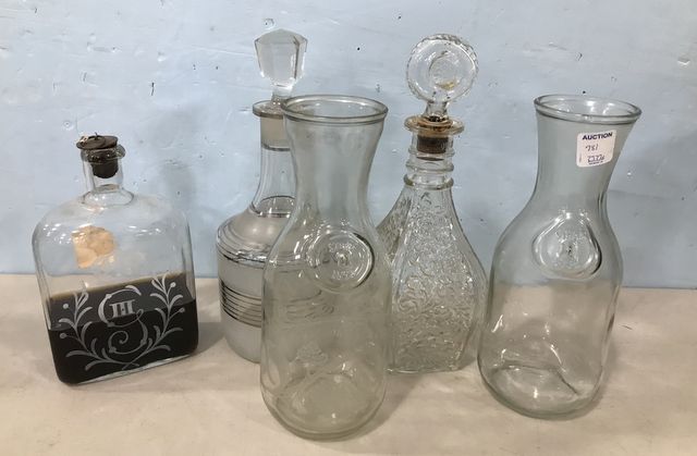 Two vintage glass carafes, and three vintage clear glass decanters. Two vintage glass carafes, and three vintage clear glass decanters.