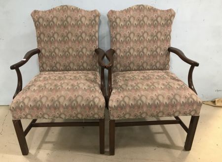 Pair of Hickory Chair Chippendale Style Arm Chairs. Warren Wright's, mahogany finish, peacock fabric, some fade on arms, 36"h. Pair of Hickory Chair Chippendale Style Arm Chairs. Warren Wright's, mahogany finish, peacock fabric, some fade on arms, 36"h.