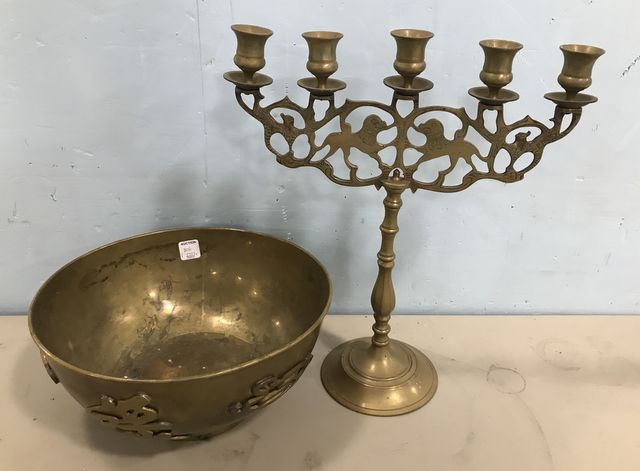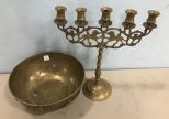 806 Brass Hong Kong Fruit Bowl and Brass Candelabra
