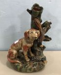 Modern Glazed Dog Pottery Figure, hunting with ducks and tree, hand painted ceramic, 11"h. Modern Glazed Dog Pottery Figure, hunting with ducks and tree, hand painted ceramic, 11"h.
