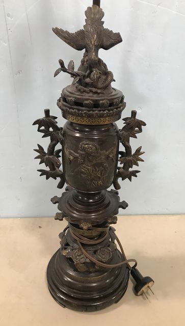 Ornate Oriental Style Metal Urn Lamp, dark patina finish, urn with bird crest, bird missing part of wing, flower base, wood stand, 31"h. Ornate Oriental Style Metal Urn Lamp, dark patina finish, urn with bird crest, bird missing part of wing, flower base, wood stand, 31"h.