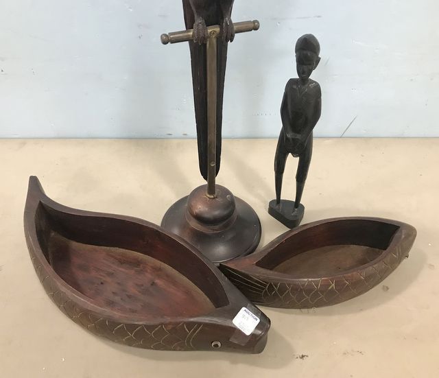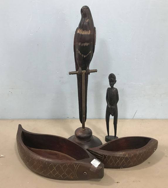 Replica Tribal Carved Decor Pieces, bird on stand (missing beak), Made in China wood fish trays, carved man statue. Replica Tribal Carved Decor Pieces, bird on stand (missing beak), Made in China wood fish trays, carved man statue.