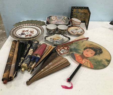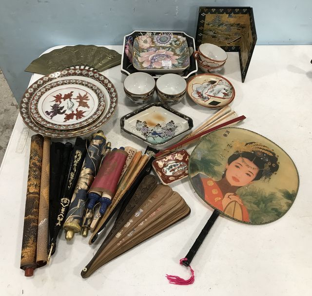 Gold Imari dish, trade winds plates, brass fan decor, Toyo dish, H.F.P. Macau dishes, assorted fans, cups and saucers. Gold Imari dish, trade winds plates, brass fan decor, Toyo dish, H.F.P. Macau dishes, assorted fans, cups and saucers.