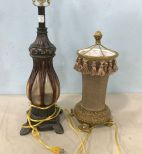 Rustic resin urn style footed lamp 32"h., and monkey upholstered dome lamp. Rustic resin urn style footed lamp 32"h., and monkey upholstered dome lamp.