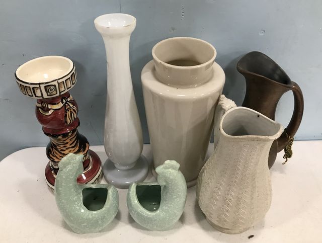Modern Pottery Vases Decor, Shannon Norton ceramic hand painted vase, glass white vase, roosters pottery. Modern Pottery Vases Decor, Shannon Norton ceramic hand painted vase, glass white vase, roosters pottery.