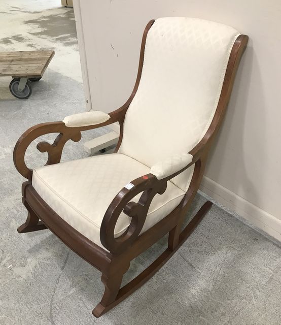 Vintage Victorian Style Rocker, white upholstery, unique design arms, 36"h Vintage Victorian Style Rocker, white upholstery, unique design arms, 36"h