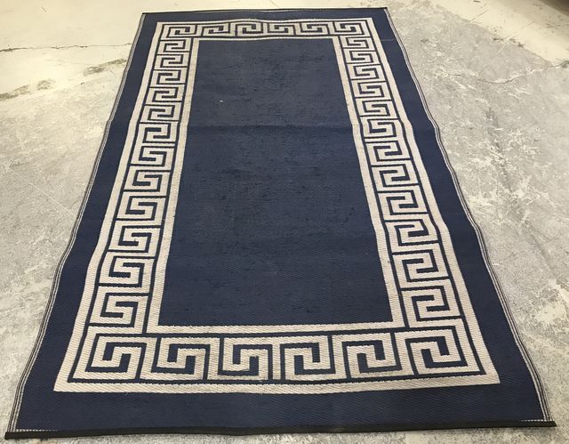 Fab Habitat Reversible Indoor/Outdoor Rug, blue and white sides, Nylon, is dirty, 8' x 5'. Fab Habitat Reversible Indoor/Outdoor Rug, blue and white sides, Nylon, is dirty, 8' x 5'.