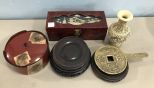 Oriental trinket box, resin carved vase, lift top storage box, brass trivet, vase stands. Oriental trinket box, resin carved vase, lift top storage box, brass trivet, vase stands.