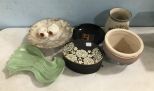 Southwest ceramic pottery vase, trinket box, USA pottery tray, marble compote, luster glass shell salt & pepper, oriental black bowl. Southwest ceramic pottery vase, trinket box, USA pottery tray, marble compote, luster glass shell salt & pepper, oriental black bowl.