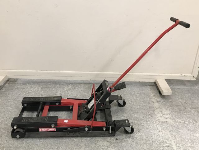 Craftsman ATV or Lawnmower Jack, on wheel, safety lock, handle, working order. Craftsman ATV or Lawnmower Jack, on wheel, safety lock, handle, working order.