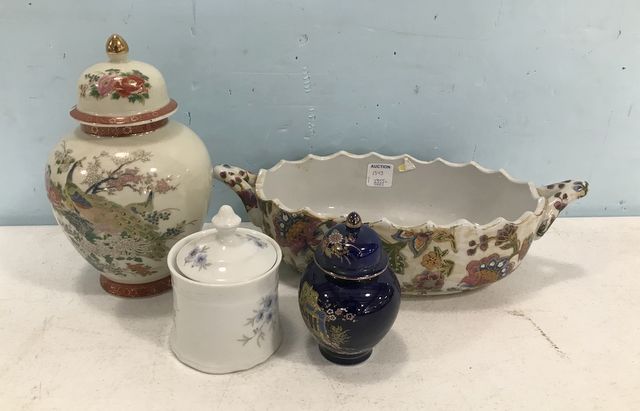 Chinese pottery potpourri container, Satsuma style vase with rim chip, small vase, and Bavaria sugar container. Chinese pottery potpourri container, Satsuma style vase with rim chip, small vase, and Bavaria sugar container.