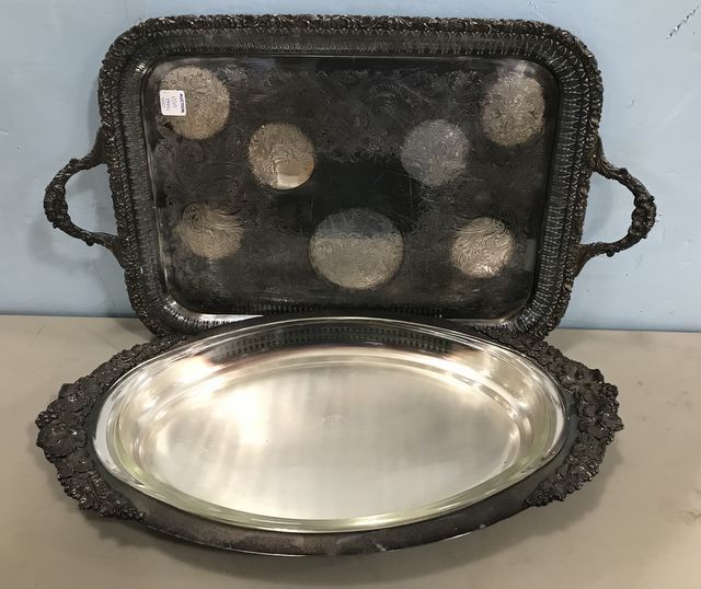 Silver plate serving tray, hanlded, has tarnish, 24"w., and glass lined serving dish silver plate 22"w. Silver plate serving tray, hanlded, has tarnish, 24"w., and glass lined serving dish silver plate 22"w.