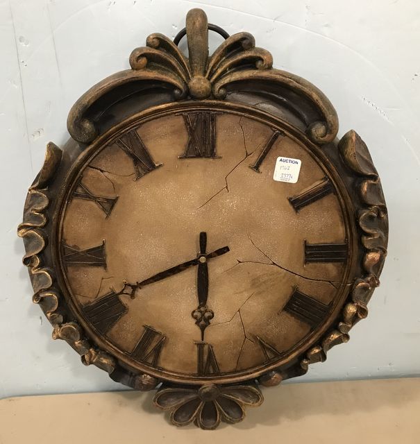 Resin Antique Gold Tone Wall Clock, battery powered, 19"h. Resin Antique Gold Tone Wall Clock, battery powered, 19"h.