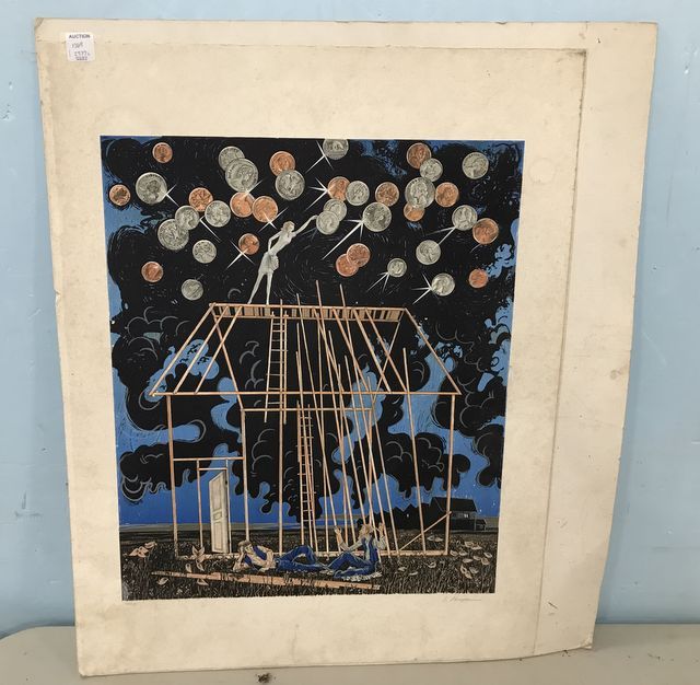 Signed Lithograph of Building House, signed bottom right, artist signed, no frame, 26"h., 23"w. Signed Lithograph of Building House, signed bottom right, artist signed, no frame, 26"h., 23"w.