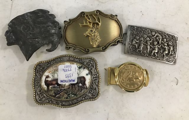 Collection of Belt Buckles, Paintree Deer head buckle, Ornate children belt buckle, brass money clip, sportsman year buckle, vintage Indian head buckle. Collection of Belt Buckles, Paintree Deer head buckle, Ornate children belt buckle, brass money clip, sportsman year buckle, vintage Indian head buckle.