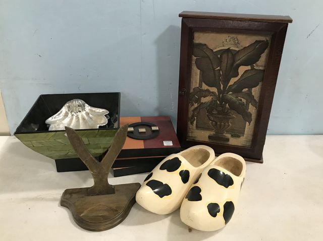 Modern display wall box, painted wood shoes, wall decor plaques, wood shelf, decorative center piece bowl, silver shell dishes. Modern display wall box, painted wood shoes, wall decor plaques, wood shelf, decorative center piece bowl, silver shell dishes.
