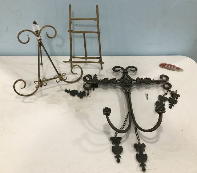 Two wall hanging plate display racks and two table display metal plate stands. Two wall hanging plate display racks and two table display metal plate stands.