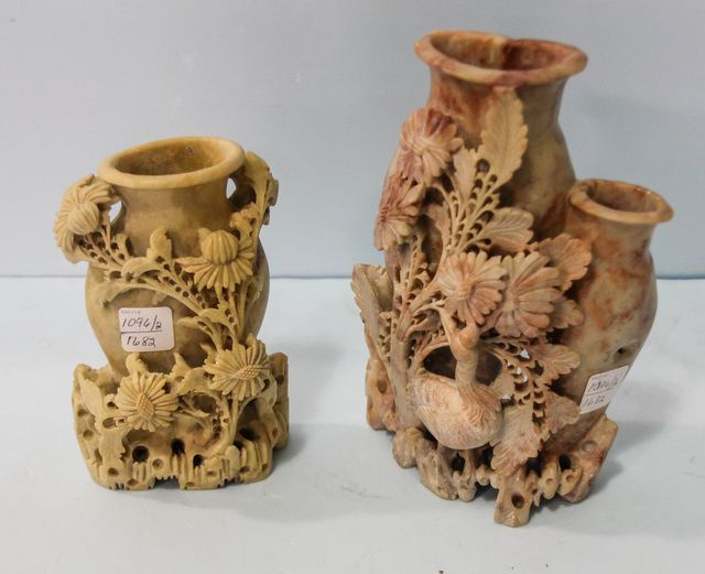 Large soapstone figurine of crane, has hole in the side 5 1/2" w., 9" h. and soapstone vase with carved flowers 5" w., 7" h. Large soapstone figurine of crane, has hole in the side 5 1/2" w., 9" h. and soapstone vase with carved flowers 5" w., 7" h.