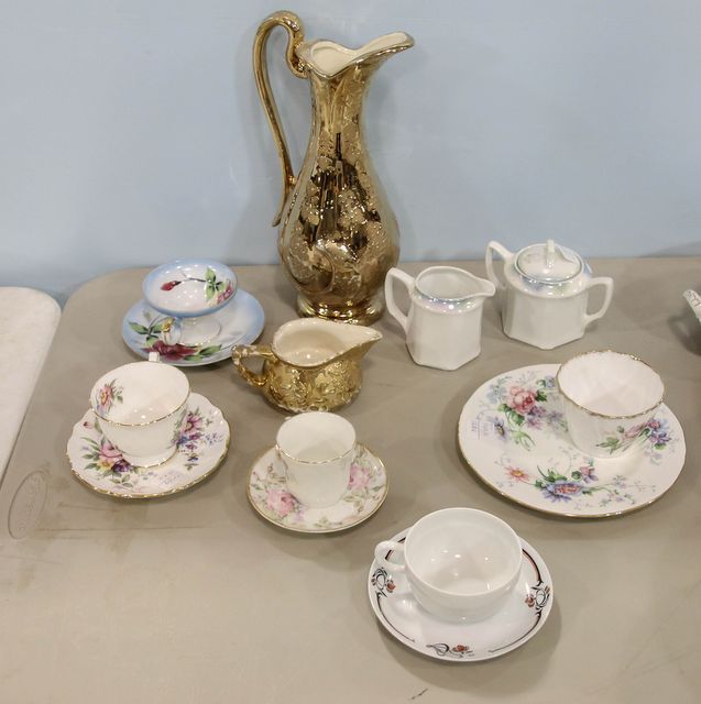 Four cups and saucers, painted cup and plate, sugar/creamer, Savoy pitcher and creamer Four cups and saucers, painted cup and plate, sugar/creamer, Savoy pitcher and creamer