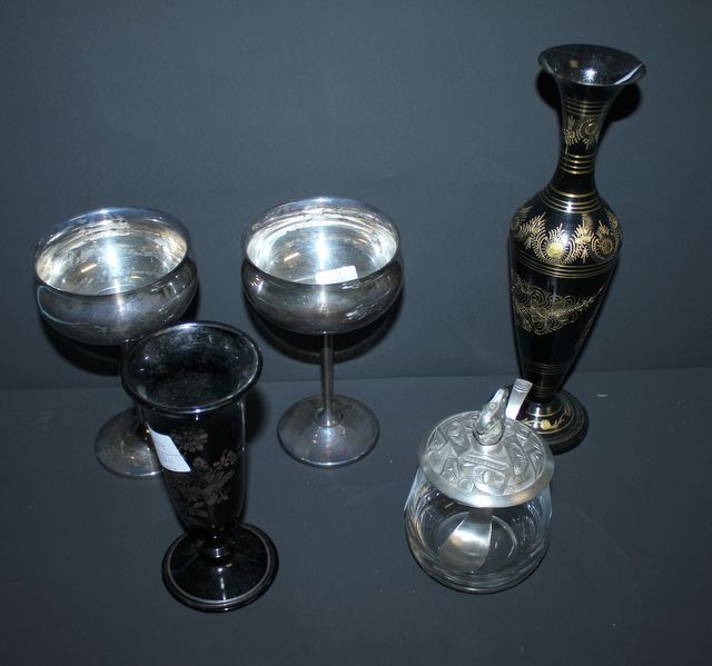 132 Two Silverplate Champaigne Glasses, Metal Vase, Black Glass Vase, Condiment