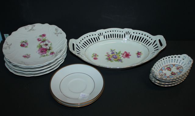 165 Reticulated Oval Dish with Four Small Dishes, Five Hand Painted Plates, and Two Saucers