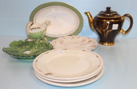 291 Sauce Dish, Royal Worchester Vegetable Bowl, Hand Painted Italian Leaf Shape Dish, Oyster or Egg Plate, McCormick Co. Tea Pot, Three Ironstone Plates