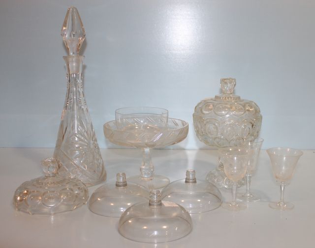 297 Cut Glass Decanter, Compote, Covered Dish, Lid, and Glasses