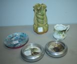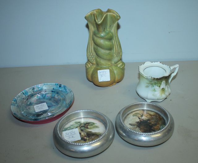 325 Two Vintagee Alluminum Coasters, Old Rs Prussia No Lid Sugar, Niolak Vase, and Decopauge Ashtray