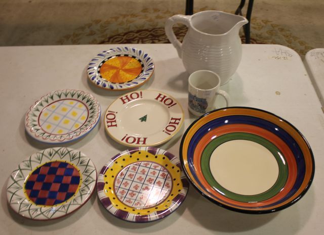 White ceramic pitcher, made in Portugal, 8" h. ; four hand painted plates 8" ; Peir 1 hand painted bowl 11 1/2" ; superbowl mug (cowboys & bills) White ceramic pitcher, made in Portugal, 8" h. ; four hand painted plates 8" ; Peir 1 hand painted bowl 11 1/2" ; superbowl mug (cowboys & bills)