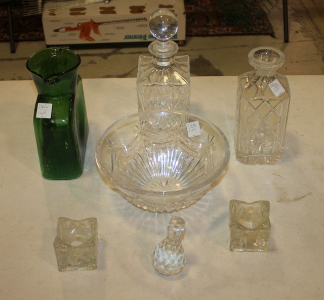 336 Two Glass Decaters, Bowl, Candle Holders, Green Vase