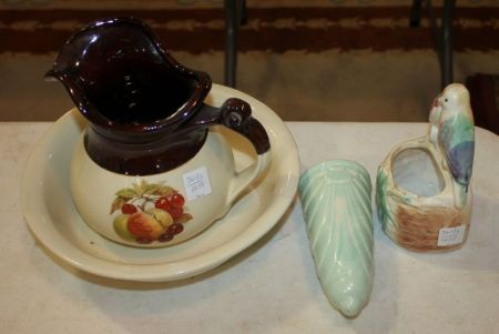 Pottery bird planter 6 1/2" h. ; wall pocket 6 1/2" h. ; small bowl and pitcher 7" h. Pottery bird planter 6 1/2" h. ; wall pocket 6 1/2" h. ; small bowl and pitcher 7" h.