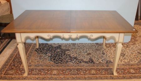 Natural wood top, painted base ; 44" w., 68" l., 29 1/2" h. ; two 21" w. leaves Natural wood top, painted base ; 44" w., 68" l., 29 1/2" h. ; two 21" w. leaves