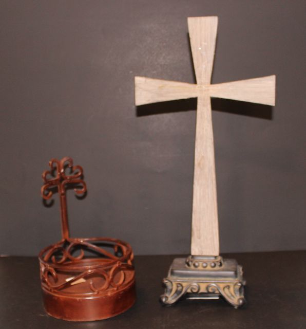 Wood cross (resin base) 18 1/4" h. ; iron display 5 7/8" dia. Wood cross (resin base) 18 1/4" h. ; iron display 5 7/8" dia.
