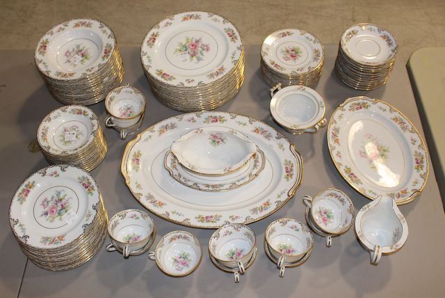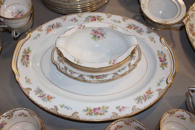 Large platter, 12 salad plates, 12 soup bowls (1 chipped), 5 cups, 12 saucers, 12 dinner plates, sugar/ creamer, 7 cups (one chipped), 11 bread/ butter, gravy boat, 12 berry bowls; 46 pieces Large platter, 12 salad plates, 12 soup bowls (1 chipped), 5 cups, 12 saucers, 12 dinner plates, sugar/ creamer, 7 cups (one chipped), 11 bread/ butter, gravy boat, 12 berry bowls; 46 pieces
