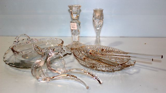 735 Pair Candlesticks, Two Crystal Ladles, and Pair Stir Sticks, and Three Dishes