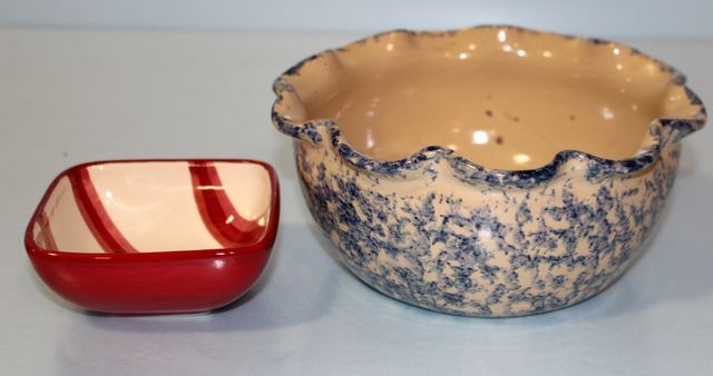 Pottery dish 4" sq. ; bowl 8" dia. Pottery dish 4" sq. ; bowl 8" dia.