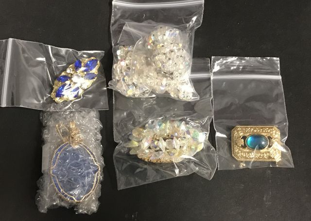 Clear stone clip on earrings, necklace, pin, gold tone three pins with blue stones. Clear stone clip on earrings, necklace, pin, gold tone three pins with blue stones.