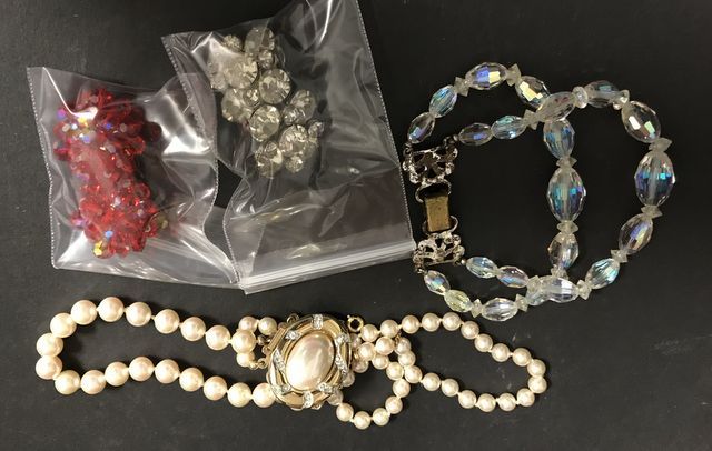 Two pair of clip on earrings, faux pearl bracelet with gold color pendant clasp, and clear glass bracelet with silver plate clasp. Two pair of clip on earrings, faux pearl bracelet with gold color pendant clasp, and clear glass bracelet with silver plate clasp.