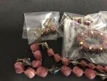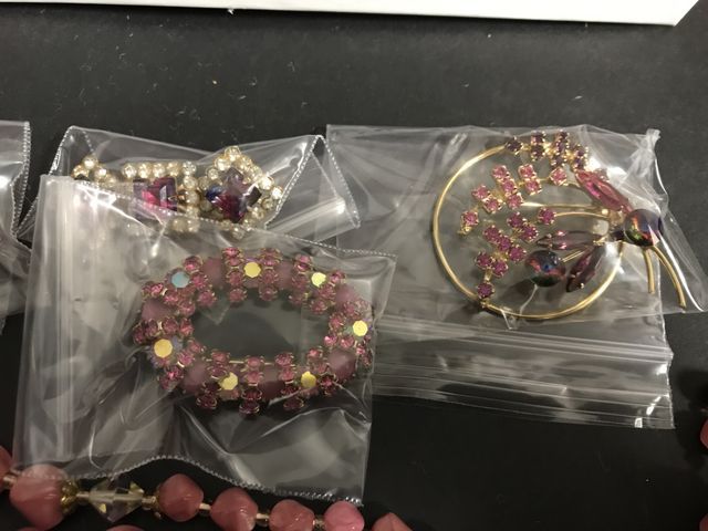 Three vintage style pins, clasp back earrings, and pink stone and glass necklace. Three vintage style pins, clasp back earrings, and pink stone and glass necklace.