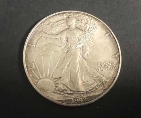 1992 Silver American Eagle Coin, 1 oz fine silver, circulated condition. 1992 Silver American Eagle Coin, 1 oz fine silver, circulated condition.