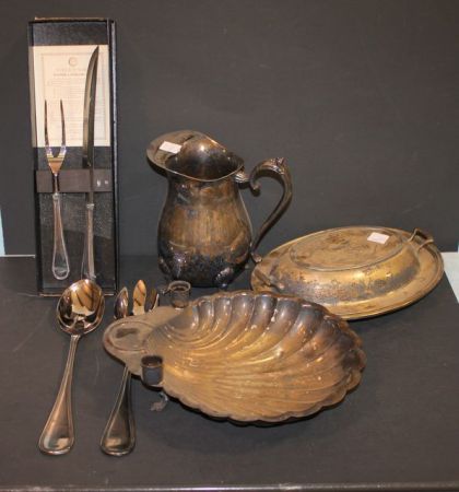 177 Carving Set, Salad Set, Silverplate Shell Dish, Pitcher, and Covered Tureen Stainless Steel Carving Set, Salad Set, Silverplate Shell Dish, Pitcher, and Covered Tureen