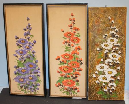 Three Oil Paintings of Flowers Two Framed 8"w., 20"h., and One unframed 7"w, 19"h. All three signed by same Artist. Three Oil Paintings of Flowers Two Framed 8"w., 20"h., and One unframed 7"w, 19"h. All three signed by same Artist.