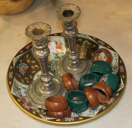 Two Silverplate Candlesticks, Tin Bowl, and Napkin Rings candlesticks Two Silverplate Candlesticks, Tin Bowl, and Napkin Rings candlesticks