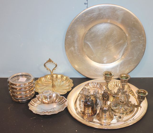 Silverplate Round Tray, Bells, Coasters, Salt and Pepper, Candlestick, and Shell Dishes Silverplate Round Tray, Bells, Coasters, Salt and Pepper, 5" dia.Candlestick, and 3" Shell Dishes Silverplate Round Tray, Bells, Coasters, Salt and Pepper, Candlestick, and Shell Dishes Silverplate Round Tray, Bells, Coasters, Salt and Pepper, 5" dia.Candlestick, and 3" Shell Dishes