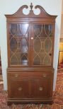 461 Small Mahogany China Cabinet with Broken Pediment Top, Two Latticework Doors, Drawer and Two Doors 34"w., 15"d., 75"h.