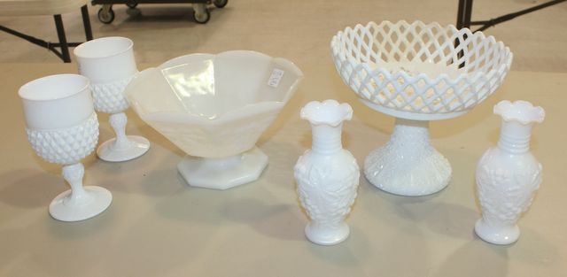 6 pcs Milk Glass 2 Goblets, 2 small vases, open lace compote, and grape pattern footed bowl 6 pcs Milk Glass 2 Goblets, 2 small vases, open lace compote, and grape pattern footed bowl